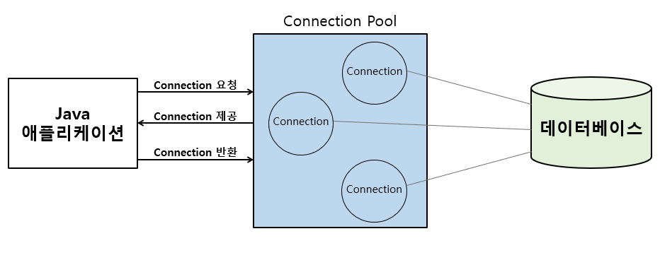 - ์ด๋ฌํ ๋ฌธ์ ๋ฅผ ํด๊ฒฐํ๊ธฐ ์ํด ์ ํ๋ฆฌ์ผ์ด์ ๋ก๋ฉ ์์ ์ Connection ๊ฐ์ฒด๋ฅผ ๋ฏธ๋ฆฌ ์์ฑํ๊ณ , ์ ํ๋ฆฌ์ผ์ด์ ์์ ๋ฐ์ดํฐ๋ฒ ์ด์ค์ ์ฐ๊ฒฐ์ด ํ์ํ ๊ฒฝ์ฐ ๋ฏธ๋ฆฌ ์ค๋น๋ Connection ๊ฐ์ฒด๋ฅผ ์ฌ์ฉํ์ฌ ์ ํ๋ฆฌ์ผ์ด์ ์ ์ฑ๋ฅ์ ํฅ์ํ๋ ์ปค๋ฅ์ ํ (Connection Pool)์ด ๋ฑ์ฅํ๊ฒ ๋๋ค.