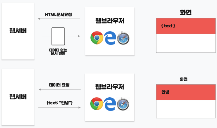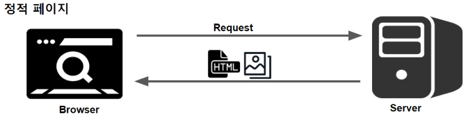 - ์น ์ ํ๋ฆฌ์ผ์ด์ ์์ ํ์ํ ๋ชจ๋ ์ ์ ๋ฆฌ์์ค๋ฅผ ์ต์ด ํ ๋ฒ๋ง ๋ค์ด๋ก๋ํ๊ณ ๊ทธ ์ดํ, ์๋ก์ด ํ์ด์ง์ ๋ํ ์์ฒญ์ด ์์ ๋๋ง๋ค ํ์ด์ง ๊ฐฑ์ ์ ํ์ํ ๋ฐ์ดํฐ๋ง ์ ๋ฌ๋ฐ์ ํ์ด์ง๋ฅผ ๊ฐฑ์ ํ๋ค. (CSR ๋ฐฉ์)