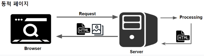 - ์๋ฒ์ ์ ์ฅ๋ HTML ํ์ผ์ด ๊ทธ๋๋ก ๋ธ๋ผ์ฐ์ ์ ๋์ค๋ ๊ฒ์ด ์๋๋ผ ๋์ ์ผ๋ก ๋ง๋ค์ด์ง๋ ์น ํ์ด์ง์ด๋ค.