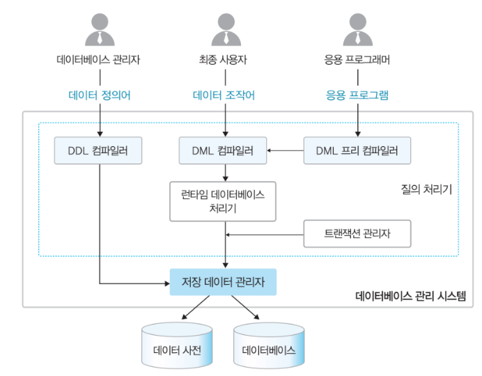 - ๋ฐ์ดํฐ๋ฒ ์ด์ค ๊ด๋ฆฌ ์์คํ ์ ์ฌ์ฉ์์ ๋ฐ์ดํฐ๋ฒ ์ด์ค ์ฌ์ด์ ์์นํ๋ฉฐ, ๊ธฐ๋ฅ์ ๋ฐ๋ผ ํฌ๊ฒ ์ง์ ์ฒ๋ฆฌ๊ธฐ์ ์ ์ฅ ๋ฐ์ดํฐ ๊ด๋ฆฌ์๋ก ๊ตฌ๋ถํ ์ ์๋ค.