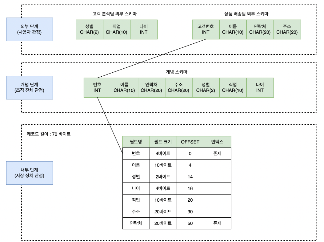 - ๋ฐ์ดํฐ๋ฒ ์ด์ค ํ๋๋ฅผ ์ธ ๋จ๊ณ๋ก ๋๋๊ณ , ๊ฐ ๋จ๊ณ๋ณ๋ก ๋ค๋ฅธ ์ถ์ํ๋ฅผ ์ ๊ณตํ๋ฉด ๋ฐ์ดํฐ๋ฒ ์ด์ค๋ฅผ ํจ๊ณผ์ ์ผ๋ก ๊ด๋ฆฌํ ์ ์๊ณ , ์ผ๋ฐ์ ์ผ๋ก ๋ด๋ถ ๋จ๊ณ์์ ์ธ๋ถ ๋จ๊ณ๋ก ๊ฐ์๋ก ์ถ์ํ ๋ ๋ฒจ์ด ๋์์ง๊ฒ ๋๋ค.